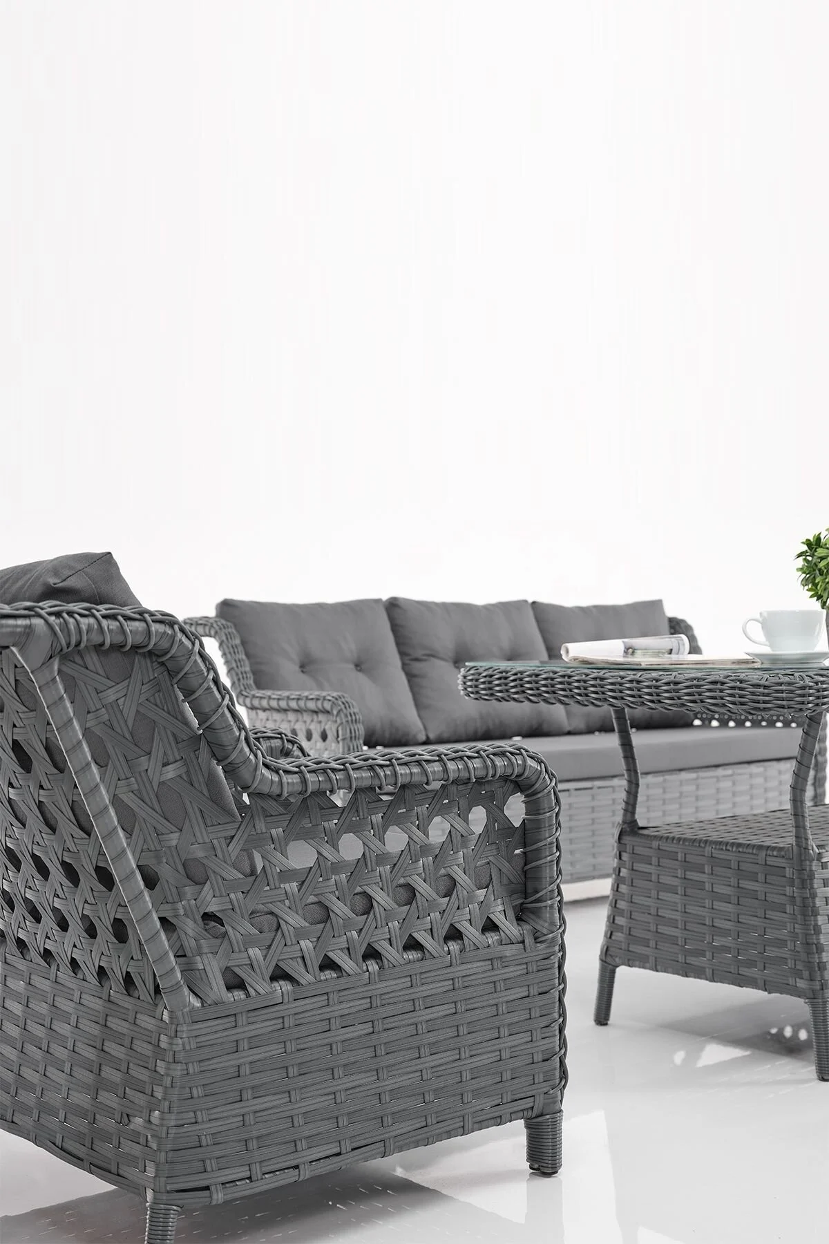 Takım; bir adet üçlü koltuk, iki adet tekli koltuk, bir adet masa ve iki adet puf tabureden oluşmaktadır. Modern gri rengi sayesinde her dekorasyon stiline kolayca uyum sağlar.